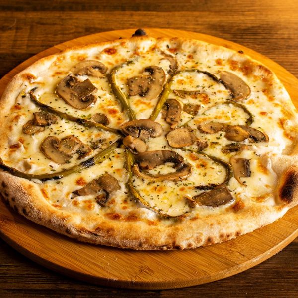 Salsa blanca bechamel, espárragos, queso mozzarella,queso parmesano, champiñones salteados ,orégano