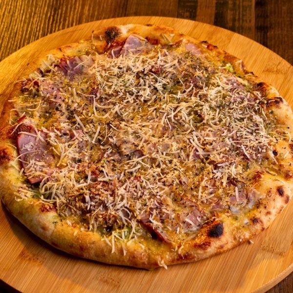 Salsa pomodoro, mozzarella, tocino huevo batido, queso parmesano y orégano