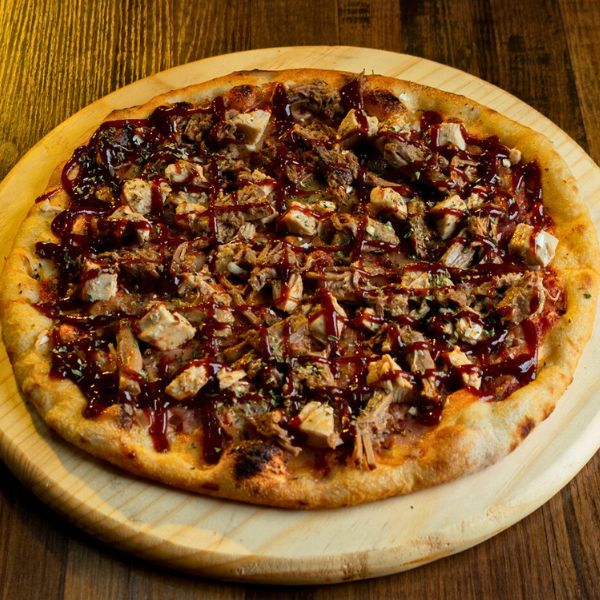 Salsa pomodoro, queso mozzarella, carne mechada, pollo, salsa barbecue, orégano